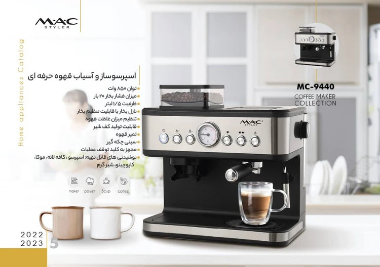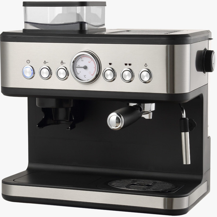 اسپرسو ساز و آسیاب قهوه حرفه ای توان 850 وات میزان فشار بخار 20 بار ظرفیت 1/5لیتر نازل بخار با قابلیت تنظیم بخار تنظیم میزان غلظت قهوه قابلیت تولید کف شیر تمپر قهوه سینی چکه گیر مجهز به کلید توقف عملیات نوشیدنی های قابل تهیه: اسپرسو، کافه لاته، موکا، کاپوچینو، شیر گرم